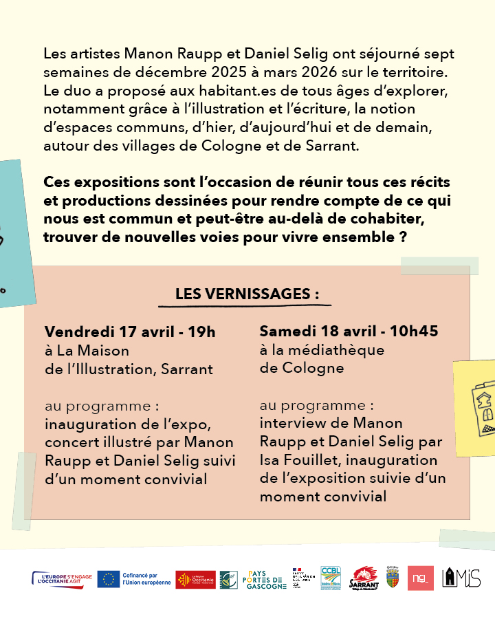 Les artistes Manon Raupp et Daniel Selig ont séjourné 7 semaines sur le territoire, et ont proposé aux habitant.es de tout âge d’explorer la notion d’espace commun grâce à l’illustration et l’écriture, d'hier, d'aujourd'hui et de demain autour des Villages de Cologne et Sarrant.