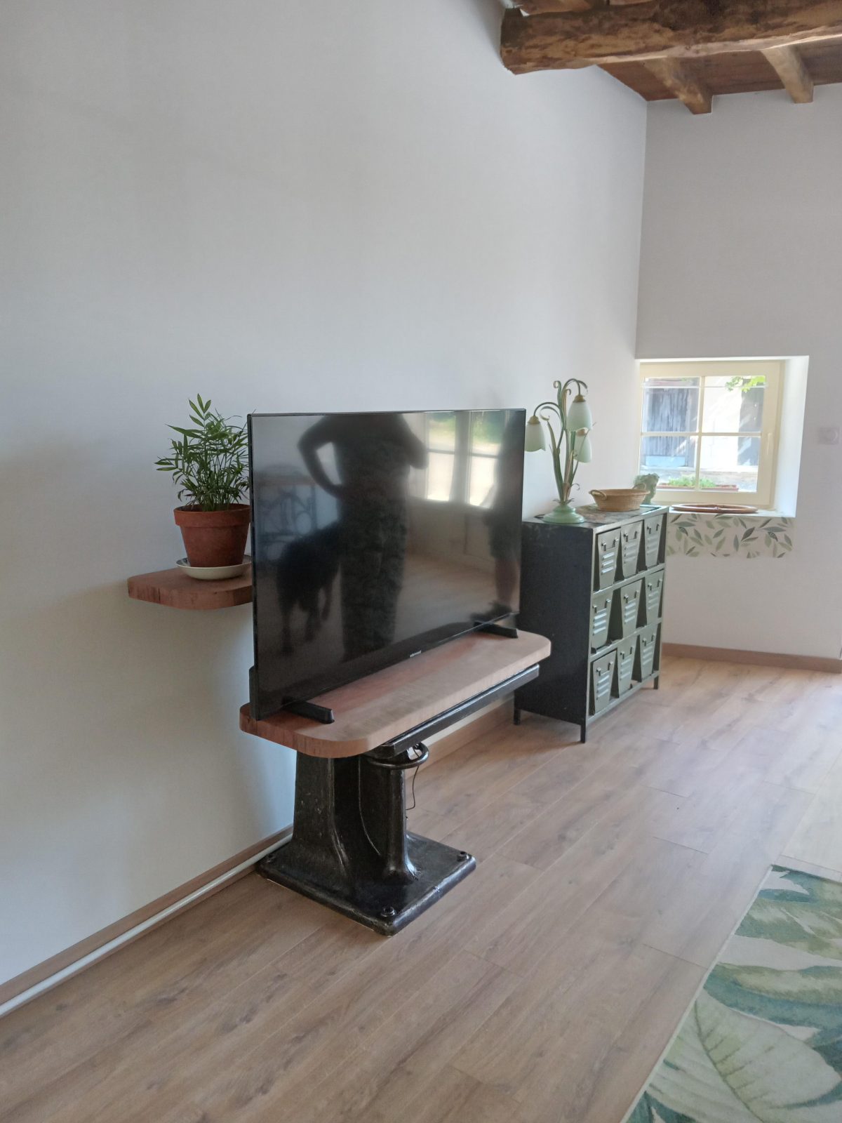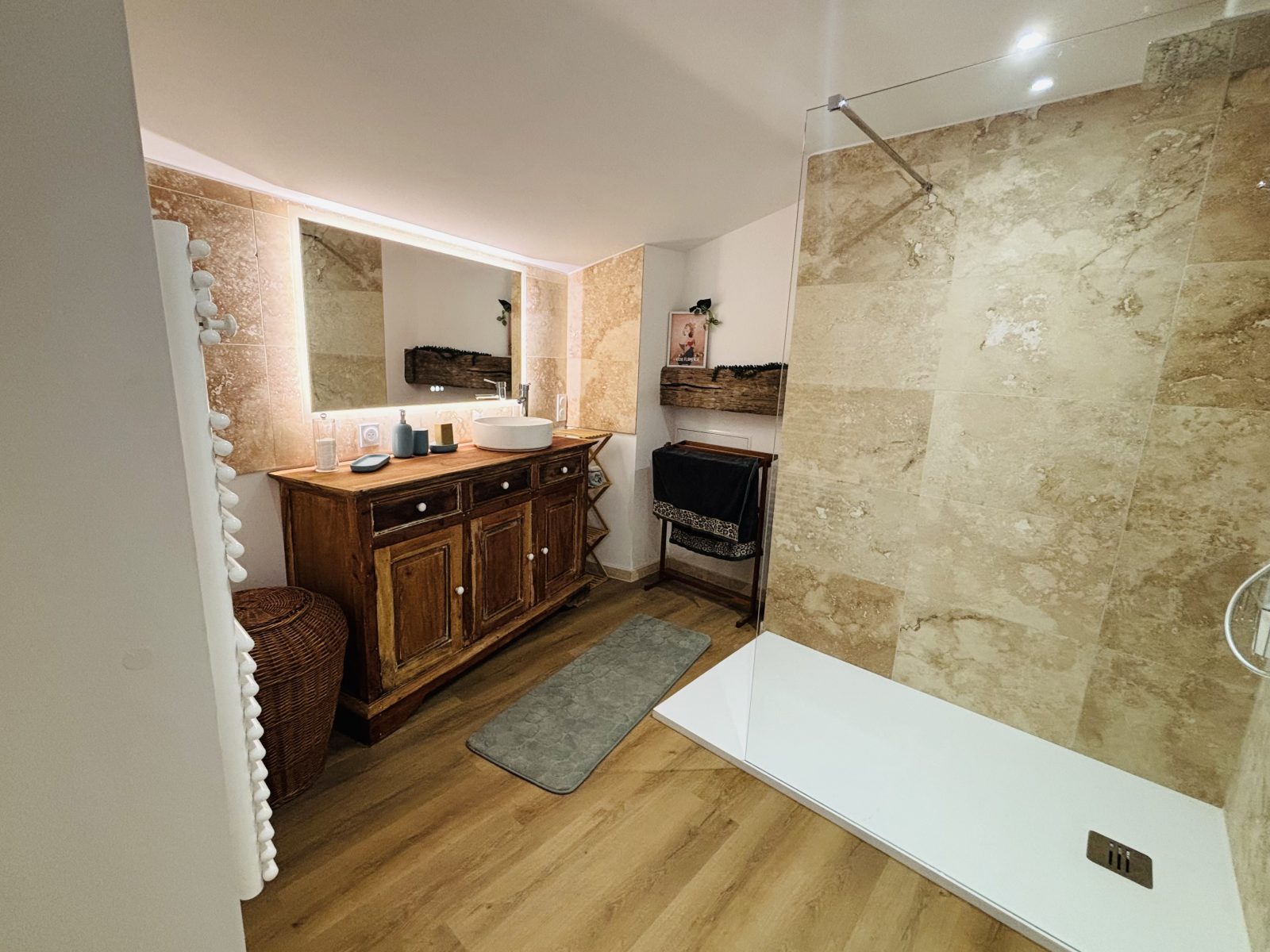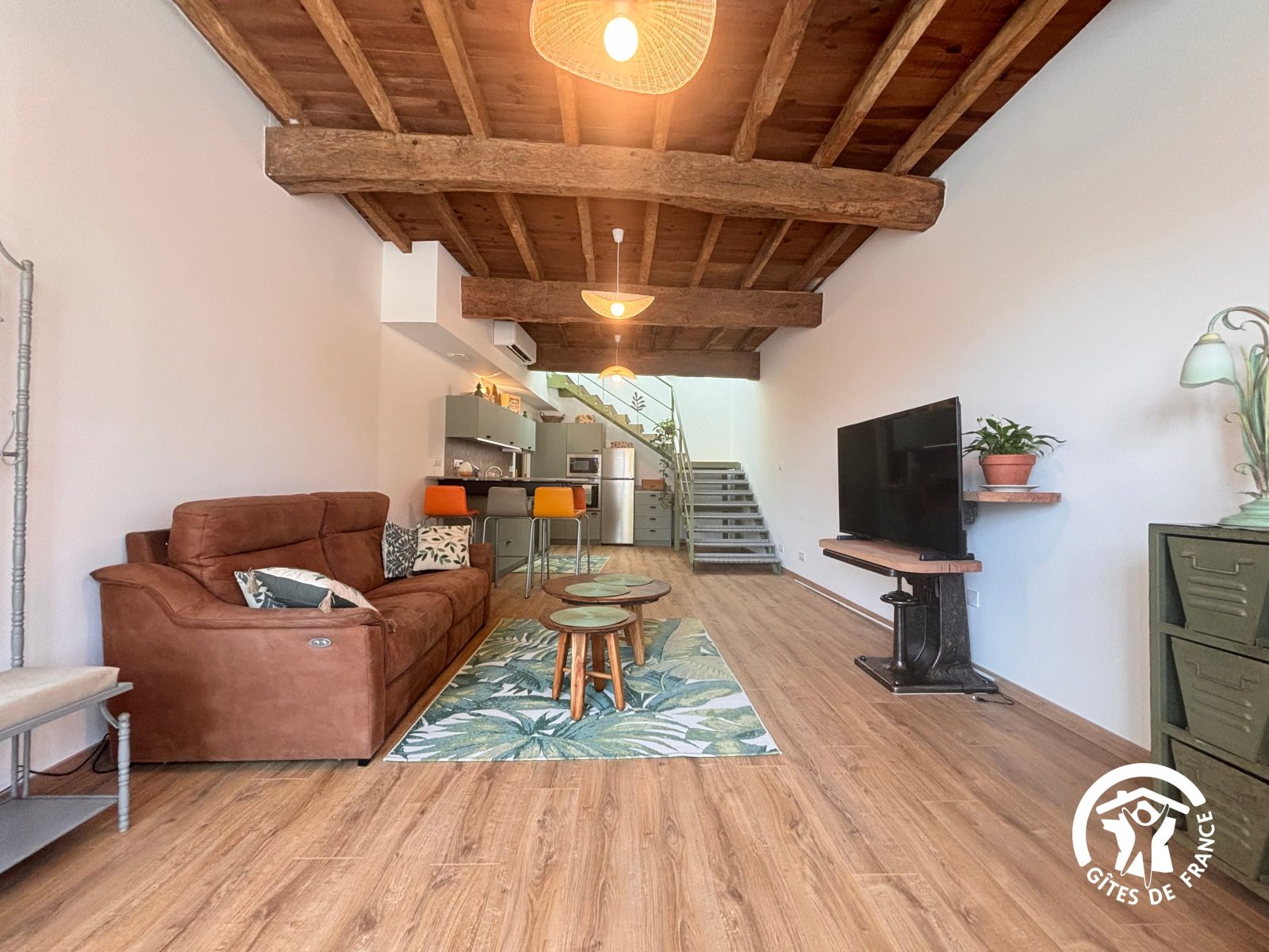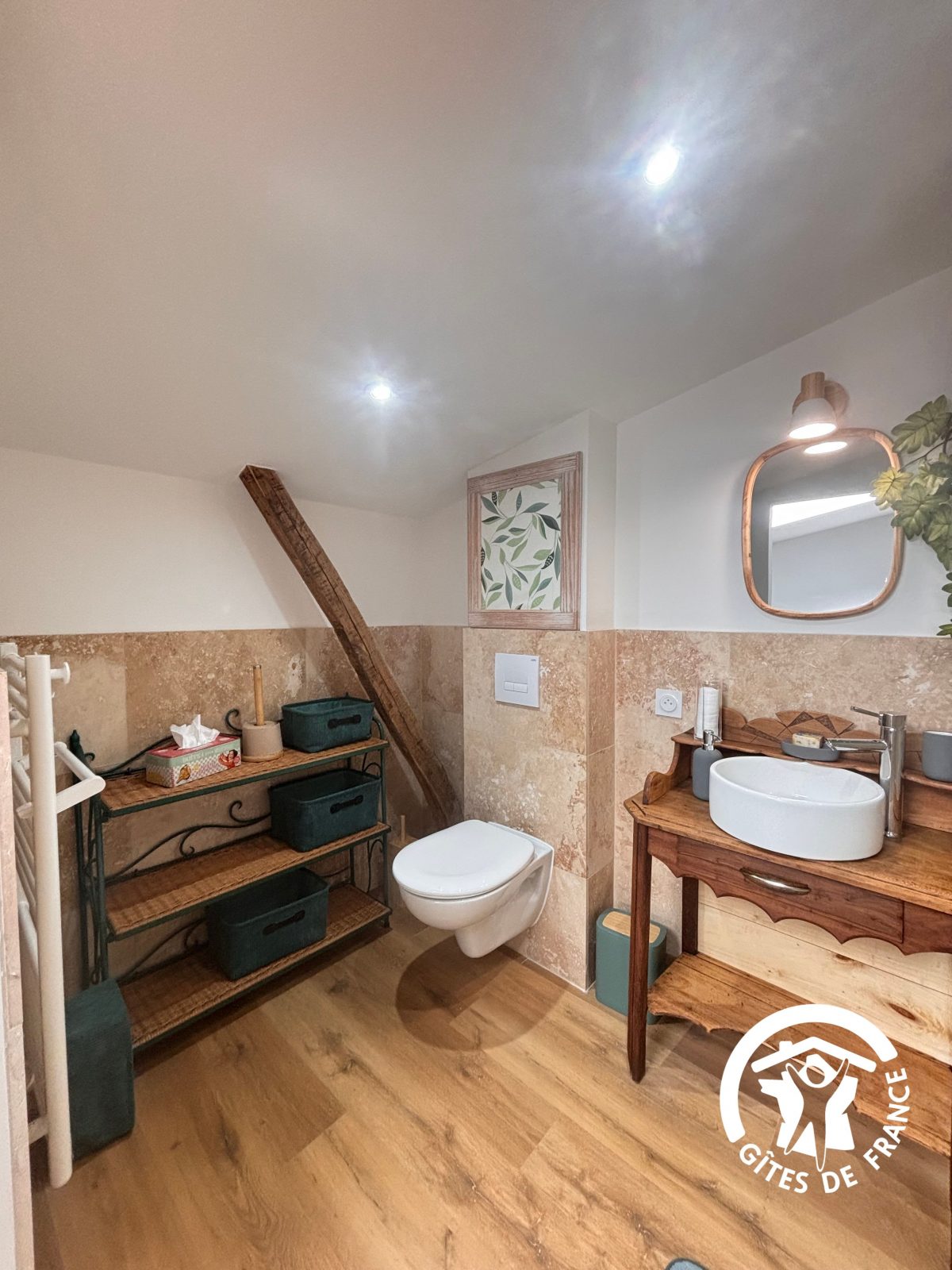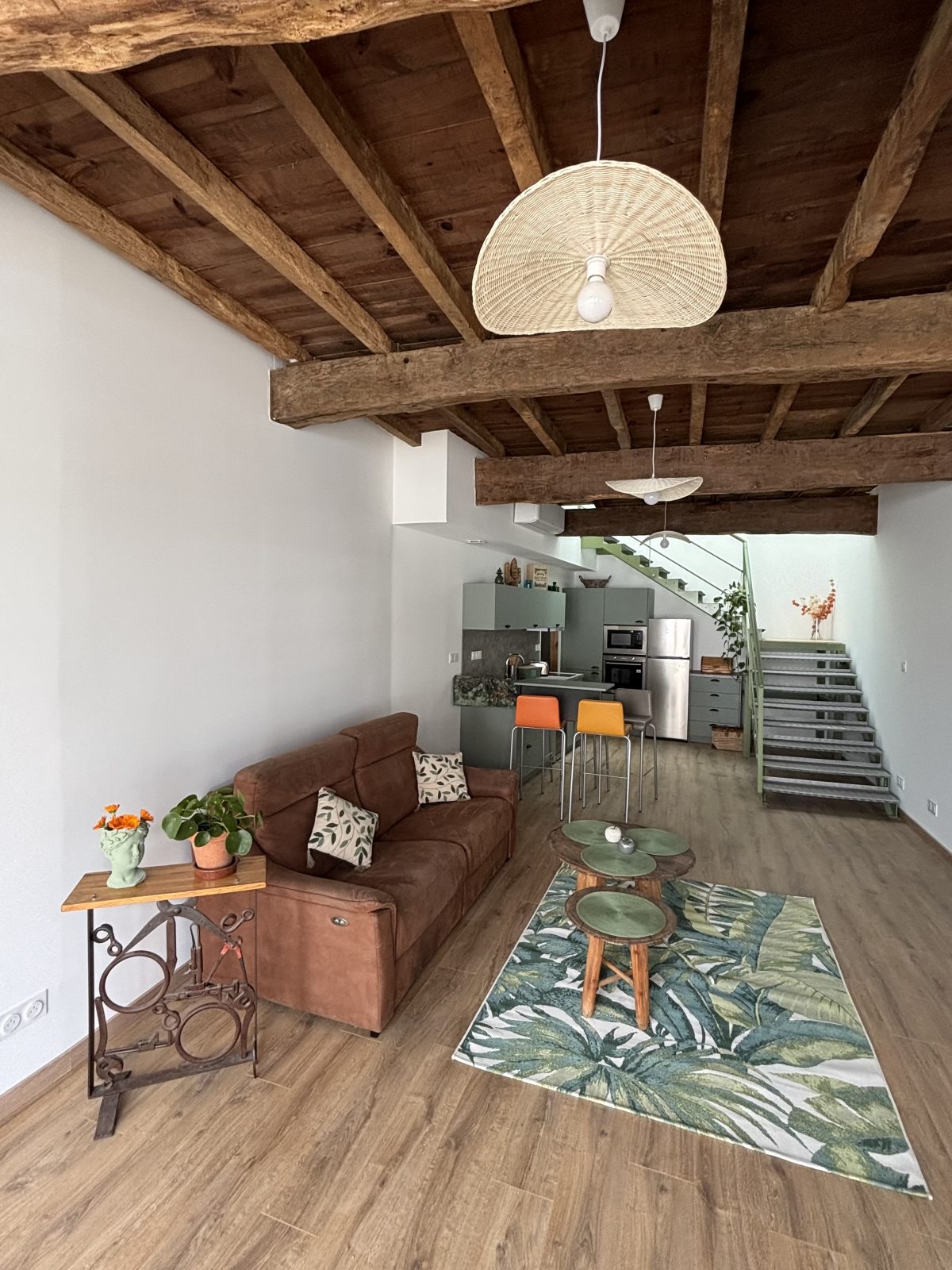 De très beaux volumes (90 m2 au total) avec un plafond haut en bois rustique. Des poutres apparentes à l’étage mais également dans la salle de bain.