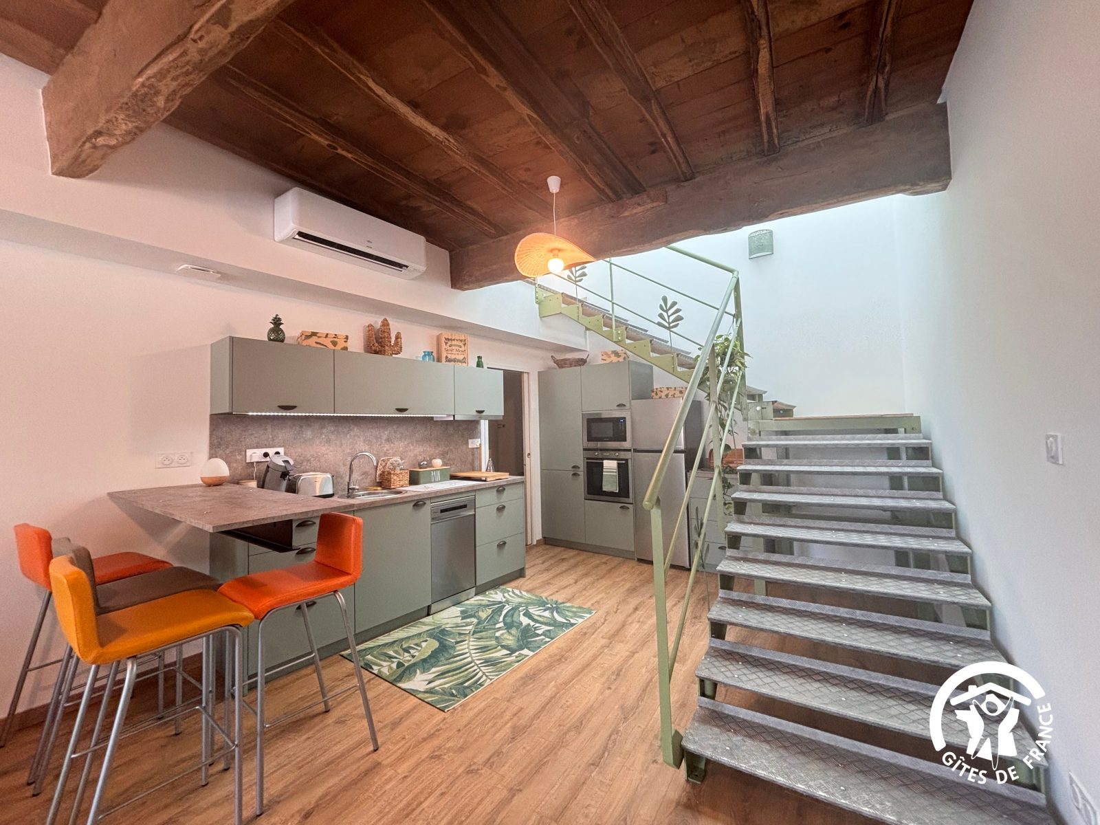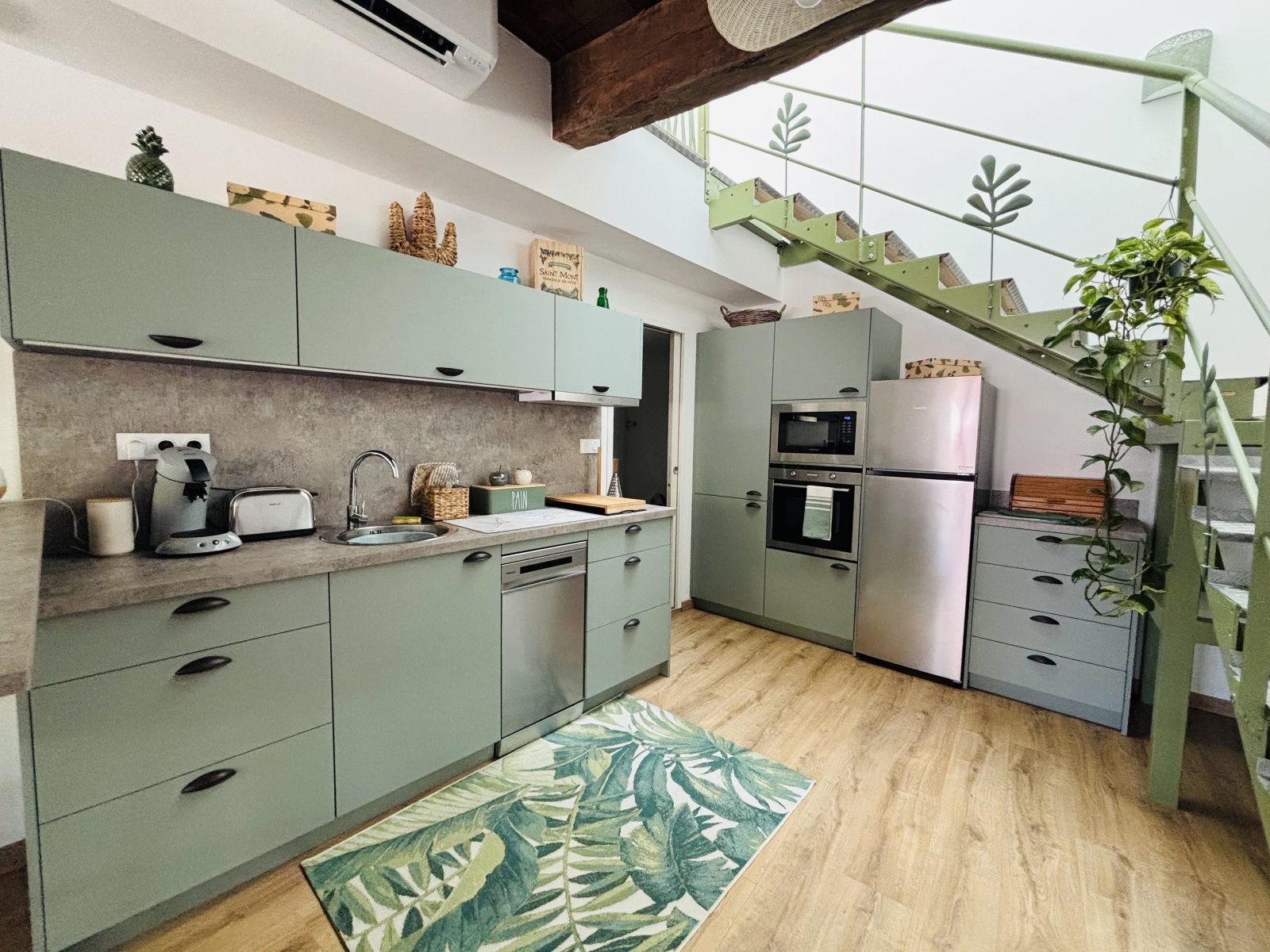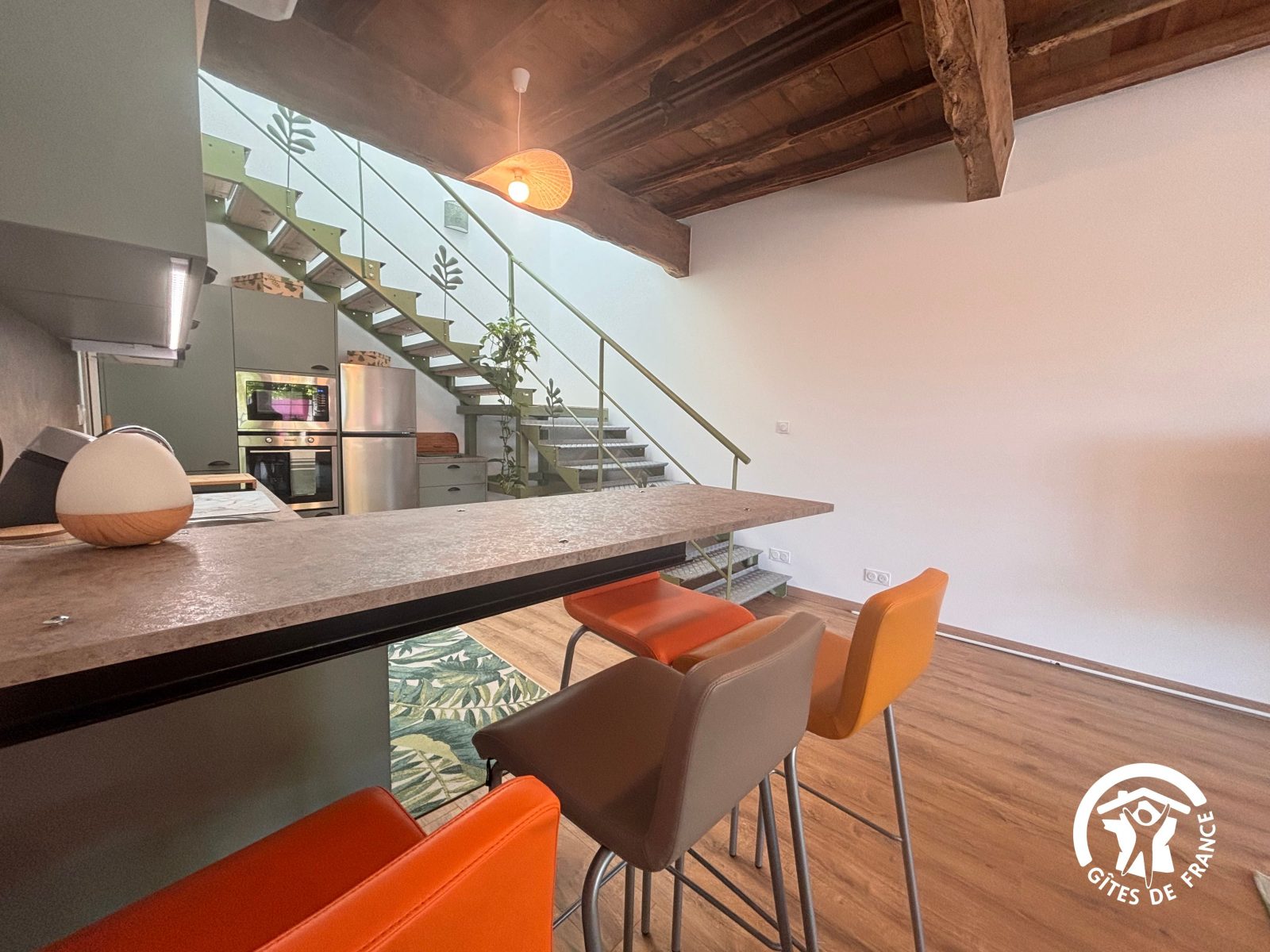 Son puits de lumière de 7 m de haut pour monter à l’étage et son style usine lui donne un charme bien à lui dans les nuances de vert /bois et blanc. Quelques petites touches d’orange lui confèrent encore un peu plus de caractère. Vous avez également la possibilité de prendre le petit déjeuner devant la baie vitrée avec la table de bistrot et chaises selon vos envies.